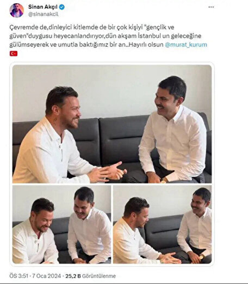 Kurum'un adaylığının ardından ünlü şarkıcı Sinan Akçıl, Kurum'la olan fotoğrafını paylaştı. Dün akşam Kurum'la görüştüklerini söyleyen Akçıl'ın paylaşımına yorum yağdı.