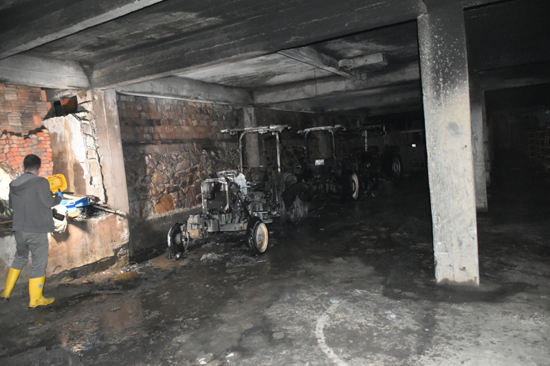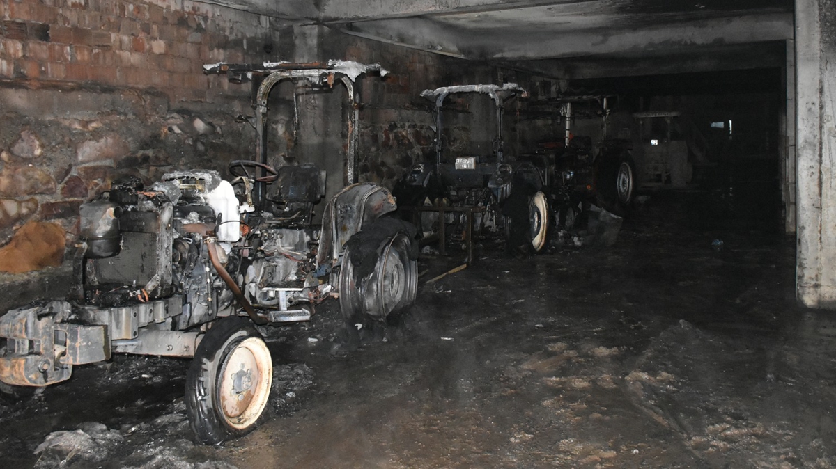 İtfaiye ekiplerinin müdahalesiyle söndürülen yangında, fabrikada bulunan üç traktör tamamen yandı.