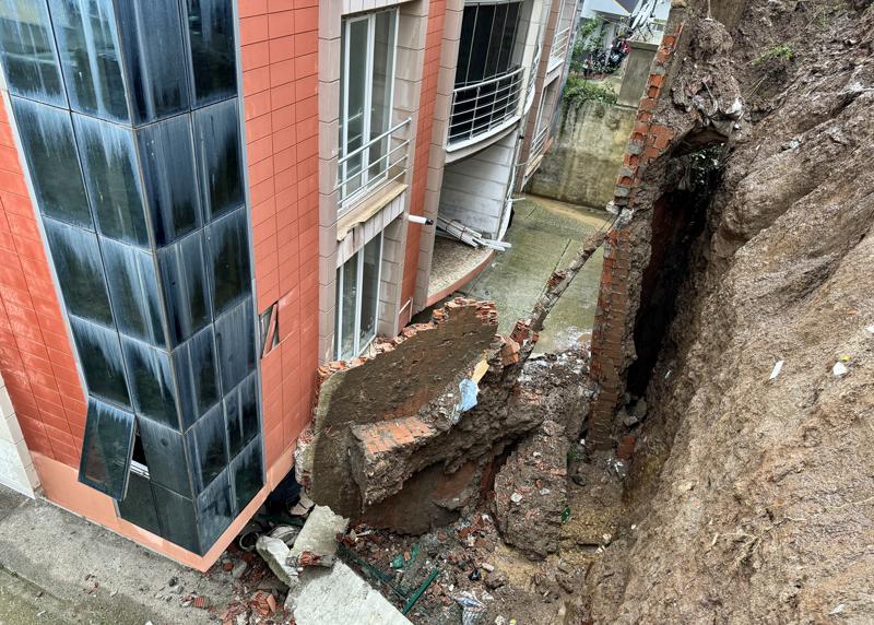 Ada Mahallesi Esen Sokak'ta 7 katlı bir binanın arka tarafında bulunan istinat duvarı şiddetli yağış nedeniyle yıkıldı.