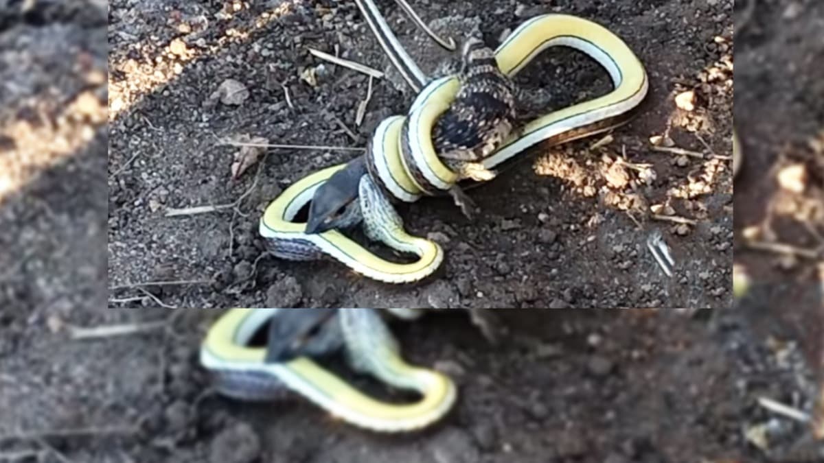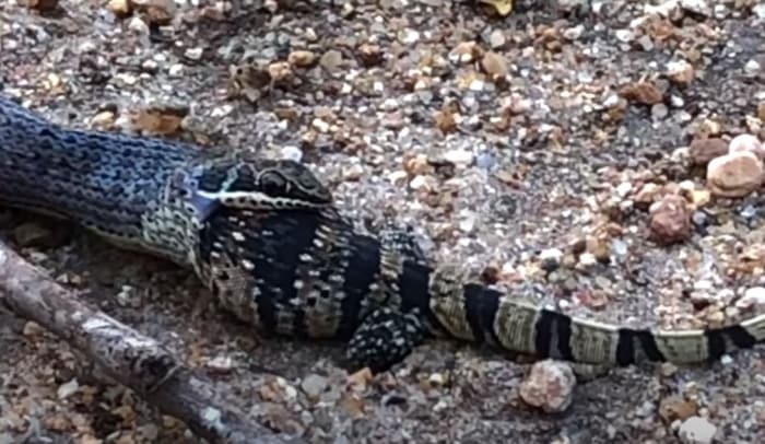 Yılan, kertenkelenin hareketsiz kalmasıyla, onu tamamen yutana kadar yavaş yavaş yemeye başlıyor.
