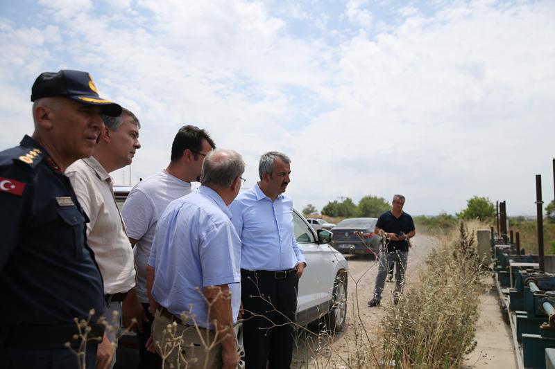 Bölgede incelemelerde bulunan Edirne Valisi Yunus Sezer, Çakmak Barajı Sulama Kooperatifi Başkanı Ünal Çelebi ile DSİ ekiplerinden bilgi aldı.