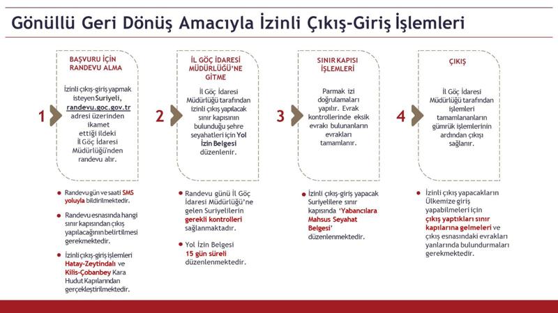 Geri dönüş işlemleri halihazırda Hatay-Cilvegözü ve Yayladağı, Kilis-Öncüpınar, Gaziantep-Karkamış ve Şanlıurfa-Akçakale kara hudut kapılarından yürütülüyor.