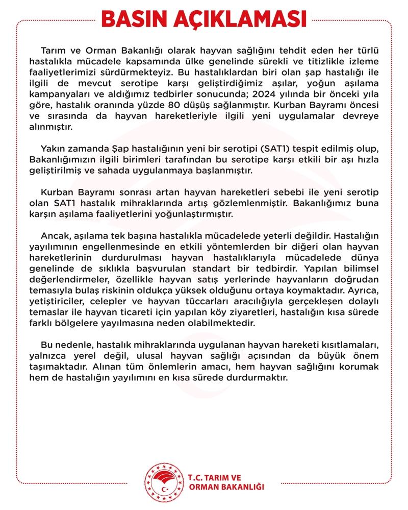 "Şap hastalığının yayılmasını önlemek ve etkin bir kontrol sağlamak amacıyla bütüncül bir mücadele stratejisi doğrultusunda, hayvanların yoğun olarak hareket ettiği hayvan pazarları, canlı hayvan borsaları, hayvan toplama ve satış merkezleri ile park ve panayırlar dahil tüm hayvan satış yerlerinin faaliyetleri geçici süreyle durdurulmuştur. Bu karar, yalnızca hastalığın kontrol altına alınmasını hızlandırmak amacıyla alınmış olup, geçici ve önleyici bir hayvan sağlığı tedbiridir. Aşılama çalışmaları hızla devam etmekte olup, hayvan popülasyonumuzun tamamının aşılanmasını takiben alınan tedbirler, hastalık durumu takibe alınarak kademeli olarak kaldırılacaktır. Bu önlemler ülkemizin gıda arz güvenliğini hiçbir şekilde tehdit etmemekte, et ve süt ürünleri başta olmak üzere hayvansal gıda temininde herhangi bir aksama beklenmemektedir. Mevcut stoklarımız ve üretim altyapımız bu süreci karşılayacak düzeydedir."