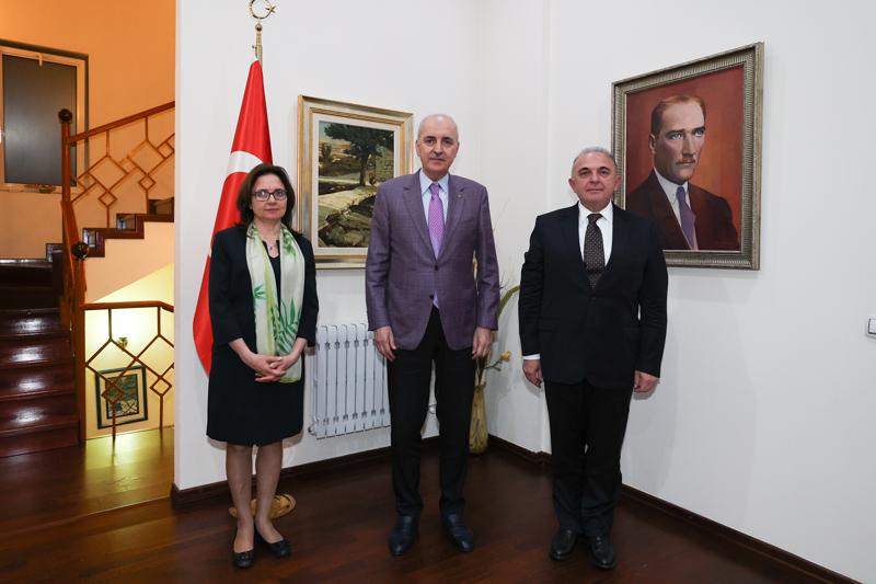 Türkiye'nin Bişkek Büyükelçisi Mekin Mustafa Kemal Ökem'den çalışmaları hakkında bilgi alan Kurtulmuş, büyükelçilik çalışanlarına başarılar diledi.