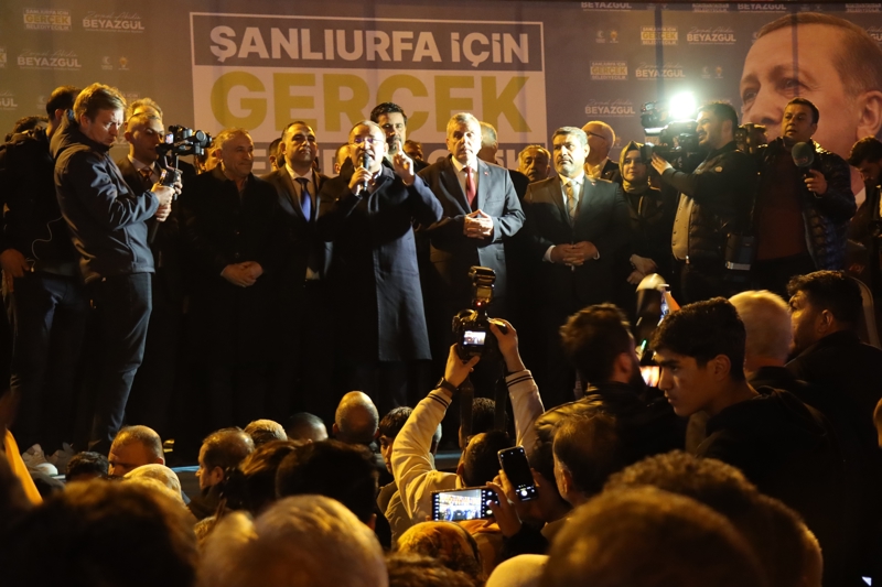 "Şanlıurfa hesapları, tuzakları bozan insanların yeridir, Şanlıurfa her zaman hakkın ve hakikatin sahibi olan insanların yeridir. 31 Mart'ta Şanlıurfa'nın önüne konan bütün oyunları bozmaya Şanlıurfa hazır mı? Şanlıurfa'nın iradesini kendi iradesi zannedenlere 'Hadi oradan' demeye var mı? Şanlıurfa 'Söz benim, karar benim, benim evladıma hesap yapamazsın, hesabı da ben yaparım, hesabı da ben görürüm' demeye var mı? Şanlıurfa'ya inanıyorum, 31 Mart'ta yeniden daha güçlü yola devam diyerek Şanlıurfa üzerine oynanan her oyunu, her hesabı bir kez daha sandığa gömecek, 'Yeniden Erdoğan, yeniden Beyazgül' diyecektir."