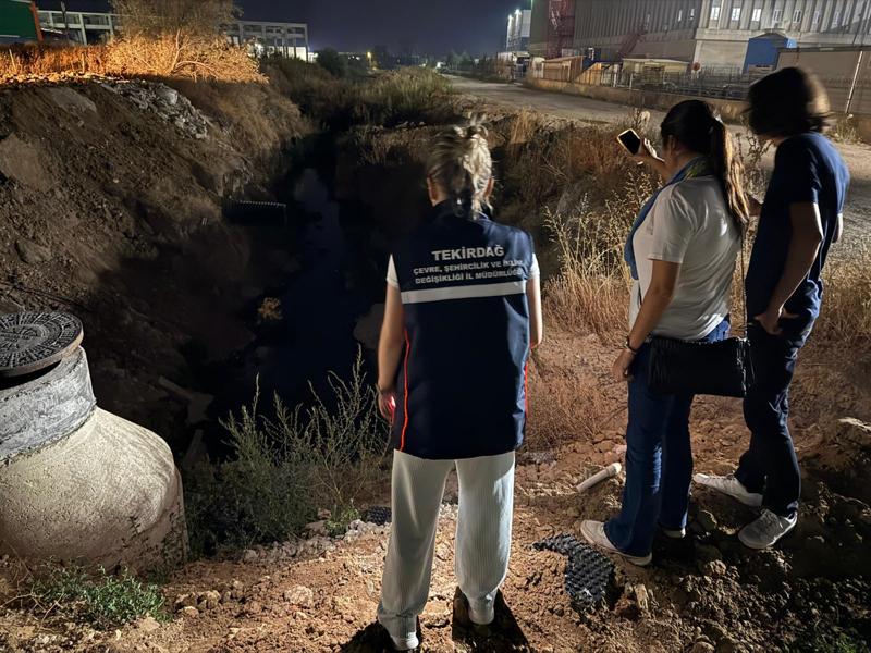 Ekipler, Çorlu Deresi ile atık su deşarjı bulunan işletmelerde yaptıkları incelemenin ardından dereden numune aldı.