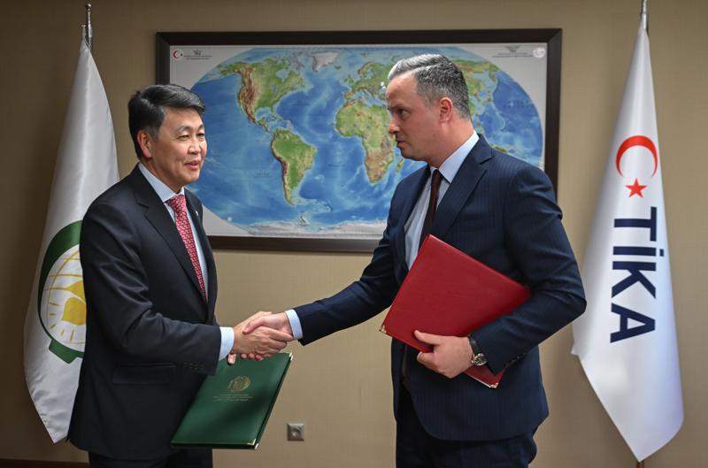 TİKA Genel Merkezi'ndeki imza törenine TİKA Başkanı Serkan Kayalar, IOFS Genel Müdürü Büyükelçi Berik Aryn ve iki kurumu temsilen heyetler katıldı.