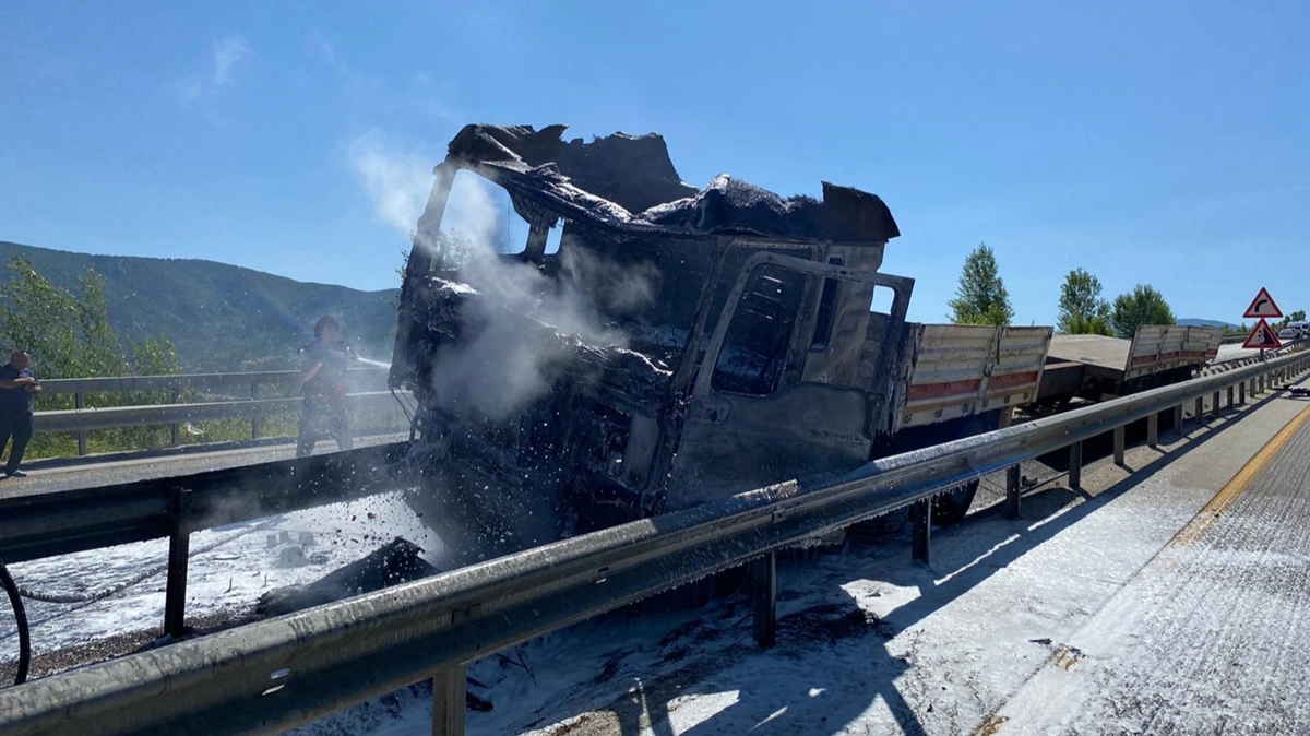 Sürücüsünün kimliği öğrenilemeyen beton blok taşıyan 06 JPT 82 plakalı tır, Çankırı-Kastamonu kara yolu İndağı mevkisinde bariyere çarpıp alev aldı.
