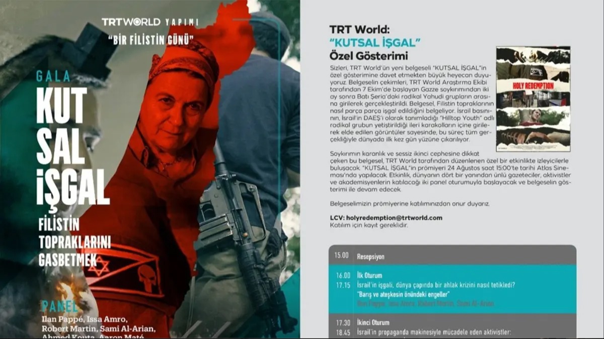 TRT World tarafından düzenlenen özel bir organizasyonla gerçekleşecek gösterime, dünyanın dört bir yanından ünlü gazeteci, aktivist ve akademisyenler katılıyor. Yahudi-İngiliz Profesör Ilan Pappe, Nazi soykırımından kurtulan Kanadalı doktor Gabor Mate'nin oğlu yazar ve aktivist Aaron Mate, Avustralyalı aktivist ve tarihçi Robert Martin, İsrailli gazeteci Gideon Levy, Filistinli düşünür Profesör Dr. Sami al-Arian, Amerikalı aktivist Medea Benjamin, Gazze'deki son çatışmalar sırasında bölgede bulunan Filistinli-Kanadalı hemşire Ahmed Kouta ve Filistinli aktivist Issa Amro gibi isimler İsrail'in işgal hareketinin ve Filistinlilere karşı uygulanan soykırımın farklı yönlerini tartışacak ve kritik bilgiler paylaşacaklar. Etkinlik, 24 Ağustos Cumartesi 15.00'te tarihi Atlas Sineması'nda başlayacak ve tüm basın mensuplarına açık olacak.