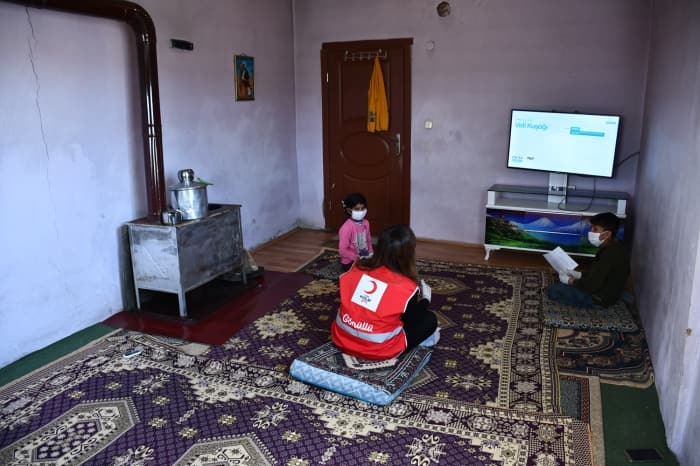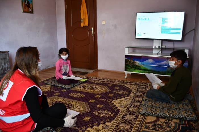 Türk Kızılay gönüllüsü olarak her gün köy köy dolaşan Göktürk, söz konusu uzaktan eğitimin verildiği EBA TV ve TRT yayınlarını nasıl takip edeceklerini köy çocuklarına evlerinde anlatıyor.