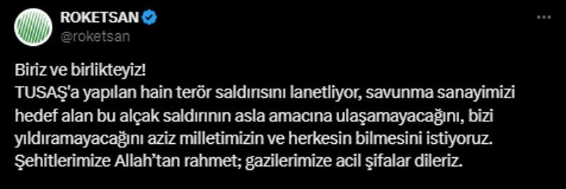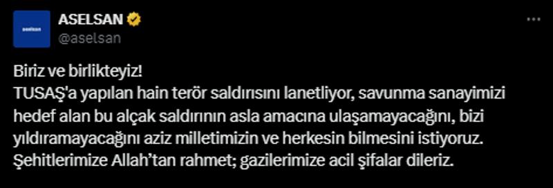 "Gerçekleştirilen saldırı sadece şirketimize yönelik değil, tüm savunma sanayimiz ve milletimize yönelik bir saldırıdır. Fakat her badireyi güçlü bir şekilde atlatan milletin bir evlatlarıyız. Bu saldırıyı da birlik ve beraberlik içerisinde atlatarak ülkemizin geleceğine yönelik ara vermeden çalışmaya devam edeceğiz. Saldırı sonucu şehit düşen mesai arkadaşlarımız ve bir vatandaşımıza Allah'tan rahmet, ailelerine ve milletimize başsağlığı, yaralılarımıza acil şifalar diliyoruz. TUSAŞ olarak şehitlerimizin hatırasını yaşatarak milli savunma sanayimize katkı sunmaya devam edeceğiz."