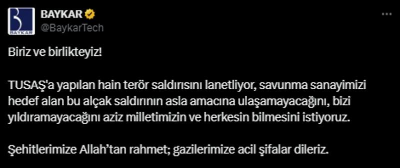 "Gerçekleştirilen saldırı sadece şirketimize yönelik değil, tüm savunma sanayimiz ve milletimize yönelik bir saldırıdır. Fakat her badireyi güçlü bir şekilde atlatan milletin bir evlatlarıyız. Bu saldırıyı da birlik ve beraberlik içerisinde atlatarak ülkemizin geleceğine yönelik ara vermeden çalışmaya devam edeceğiz. Saldırı sonucu şehit düşen mesai arkadaşlarımız ve bir vatandaşımıza Allah'tan rahmet, ailelerine ve milletimize başsağlığı, yaralılarımıza acil şifalar diliyoruz. TUSAŞ olarak şehitlerimizin hatırasını yaşatarak milli savunma sanayimize katkı sunmaya devam edeceğiz."