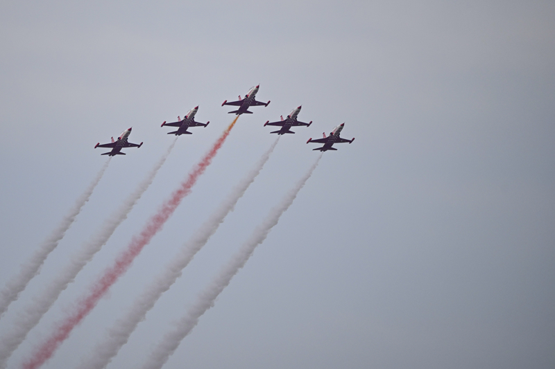 Yaklaşık 30 dakika süren prova uçuşlarında NF-5 jetleri, havada çeşitli manevralar yaptı. Uçuş esnasında arkasında kırmızı-beyaz izler bırakan jetlerin gökyüzündeki gösterisini ilgiyle takip eden vatandaşlar, o anları cep telefonu kamerasıyla görüntüledi.