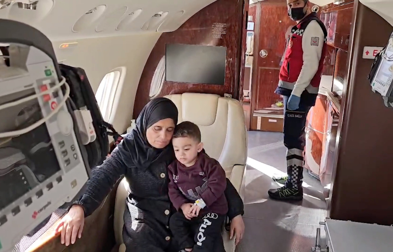 Gazze'den geçişi sağlanarak Mısır'ın El Ariş Havalimanı'na getirilen çocukları alan ve Türkiye'ye doğru hareket eden ambulans uçak, Esenboğa Havalimanı'na indi.