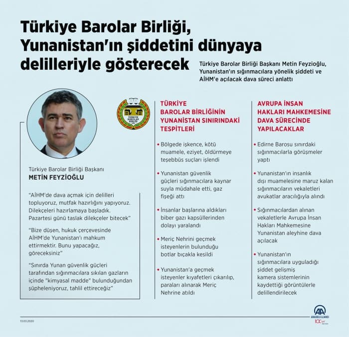Edirne Cumhuriyet Başsavcılığının da yaşananları delillendirmeye devam ettiğini bildiren Feyzioğlu, Edirne Barosu Başkanı Alper Pınar başkanlığındaki baroya kayıtlı avukatların, Yunanistan aleyhine AİHM'de dava açmak isteyen sığınmacılarla görüştüğünü söyledi.