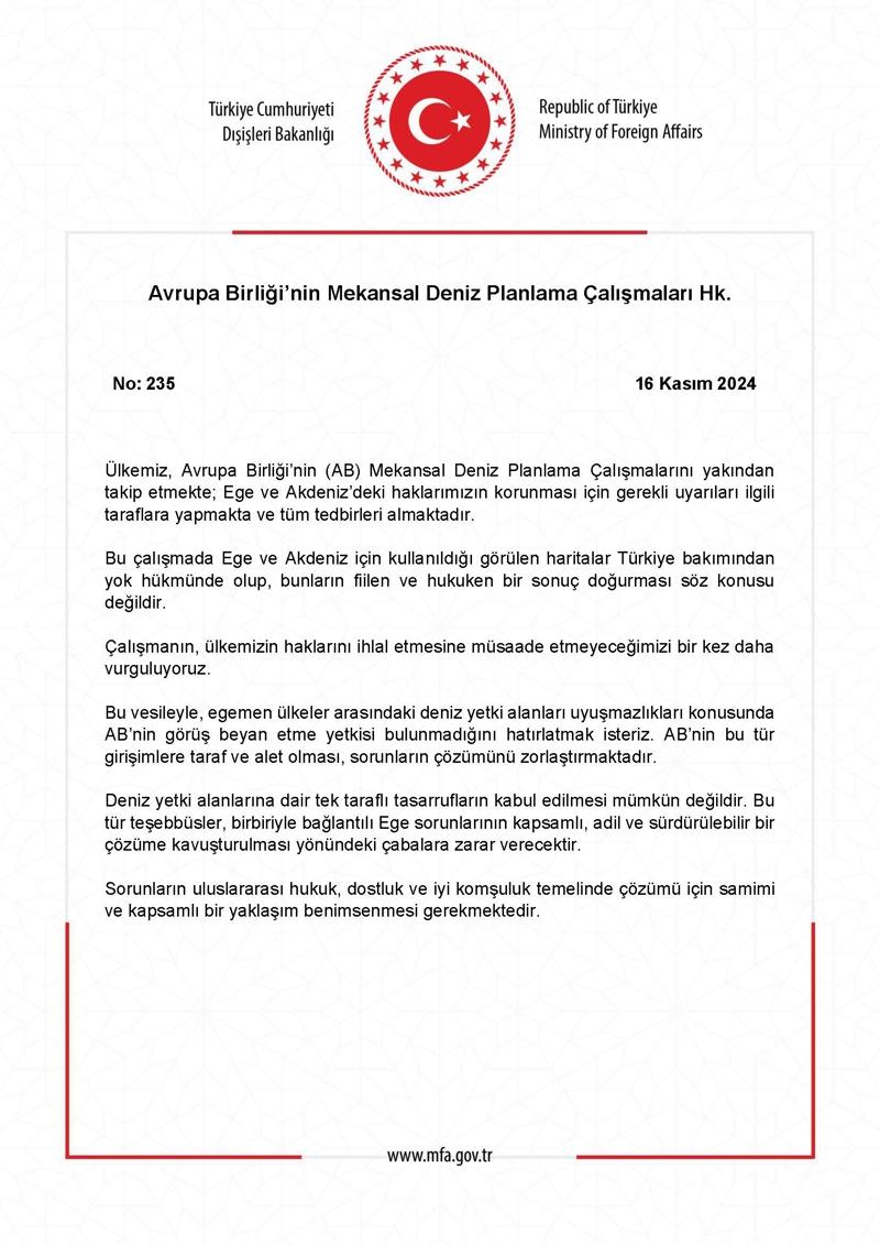 Açıklamada, "Bu çalışmada Ege ve Akdeniz için kullanıldığı görülen haritalar Türkiye bakımından yok hükmünde olup, bunların fiilen ve hukuken bir sonuç doğurması söz konusu değildir. Çalışmanın, ülkemizin haklarını ihlal etmesine müsaade etmeyeceğimizi bir kez daha vurguluyoruz." ifadeleri kullanıldı.