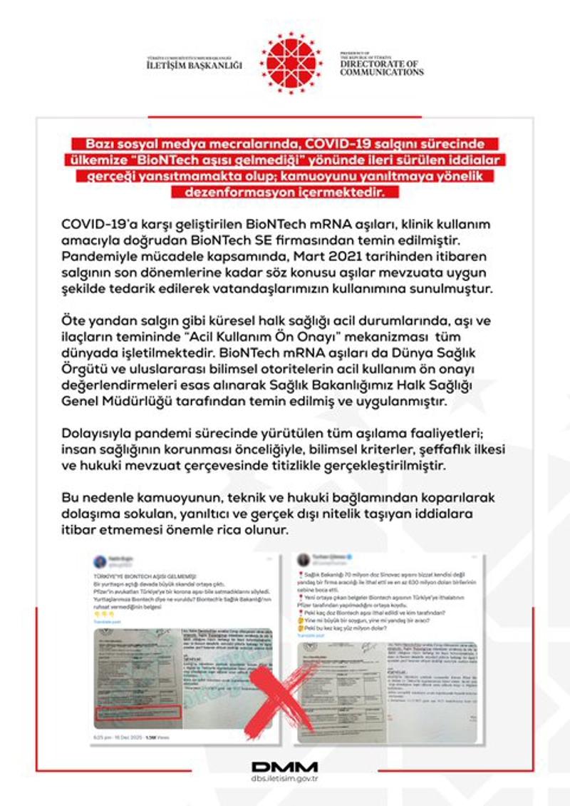 "Pandemiyle mücadele kapsamında, Mart 2021 tarihinden itibaren salgının son dönemlerine kadar söz konusu aşılar mevzuata uygun şekilde tedarik edilerek vatandaşlarımızın kullanımına sunulmuştur. Öte yandan salgın gibi küresel halk sağlığı acil durumlarında, aşı ve ilaçların temininde 'Acil Kullanım Ön Onayı' mekanizması tüm dünyada işletilmektedir. BioNTech mRNA aşıları da Dünya Sağlık Örgütü ve uluslararası bilimsel otoritelerin acil kullanım ön onayı değerlendirmeleri esas alınarak Sağlık Bakanlığımız Halk Sağlığı Genel Müdürlüğü tarafından temin edilmiş ve uygulanmıştır. Dolayısıyla pandemi sürecinde yürütülen tüm aşılama faaliyetleri insan sağlığının korunması önceliğiyle, bilimsel kriterler, şeffaflık ilkesi ve hukuki mevzuat çerçevesinde titizlikle gerçekleştirilmiştir. Bu nedenle kamuoyunun, teknik ve hukuki bağlamından koparılarak dolaşıma sokulan, yanıltıcı ve gerçek dışı nitelik taşıyan iddialara itibar etmemesi önemle rica olunur."