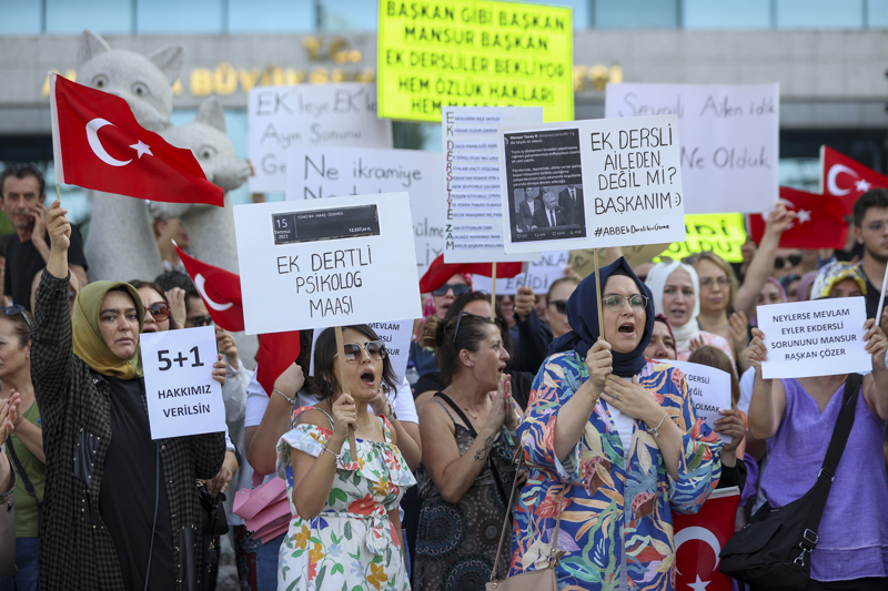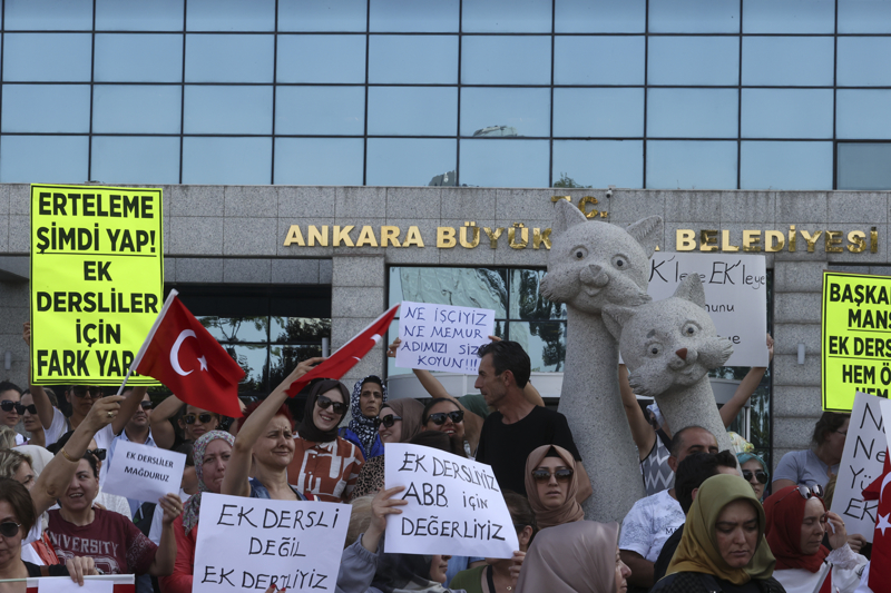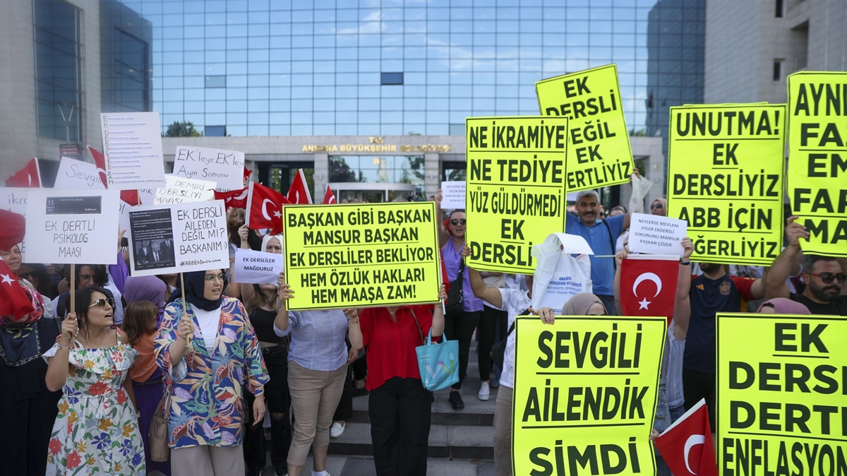 ABB önünde toplanan ve ellerinde "Ek dersliler mağdur", "Ek dersli, aileden değil mi?" gibi çeşitli dövizler taşıyan usta öğreticiler, Büyükşehir Belediye Başkanı Mansur Yavaş'la görüşme taleplerini dile getirdi.