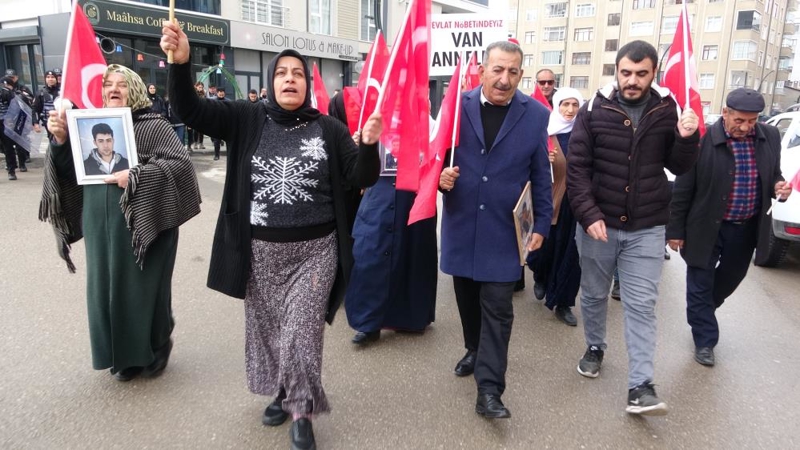 Menekşe Sokak'ta bir araya gelen aileler, "Evlat nöbetindeyiz", "Artık yeter, yakamızdan düşün", "Şehidime dokunma, onlar bize emanet", "Çocuklarımız kimsenin piyonu olmayacak" ve "Van anneleri evlat nöbetinde" yazılı dövizler taşıdı.