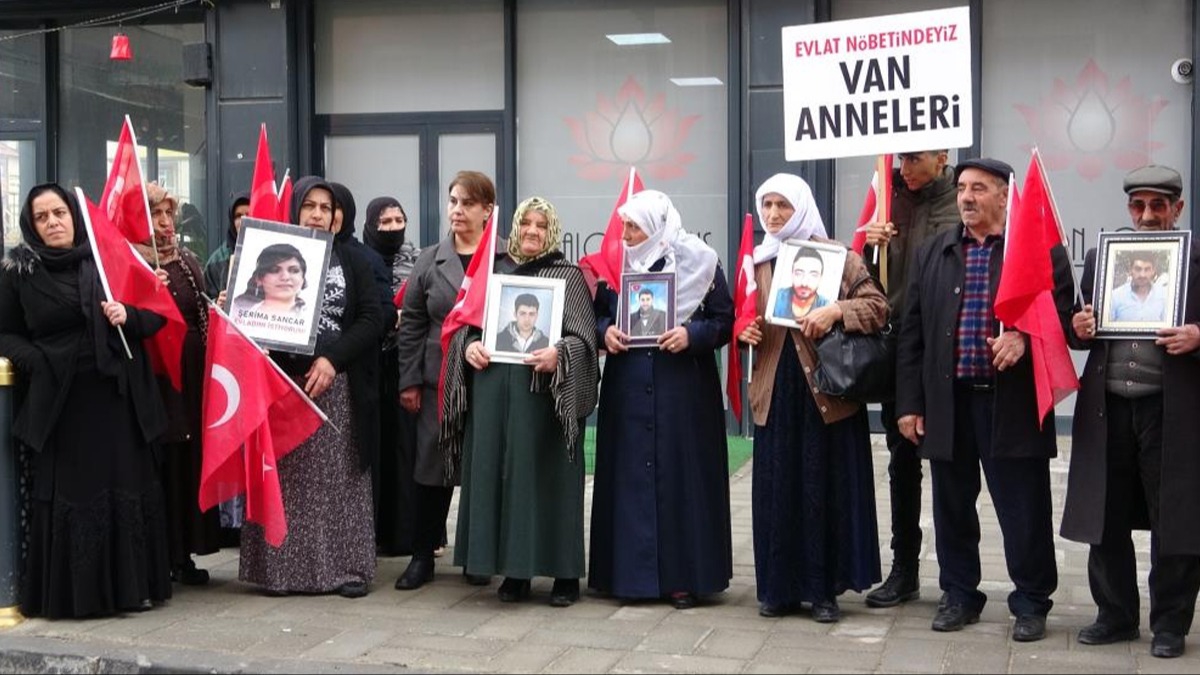 Menekşe Sokak'ta bir araya gelen aileler, "Evlat nöbetindeyiz", "Artık yeter, yakamızdan düşün", "Şehidime dokunma, onlar bize emanet", "Çocuklarımız kimsenin piyonu olmayacak" ve "Van anneleri evlat nöbetinde" yazılı dövizler taşıdı.