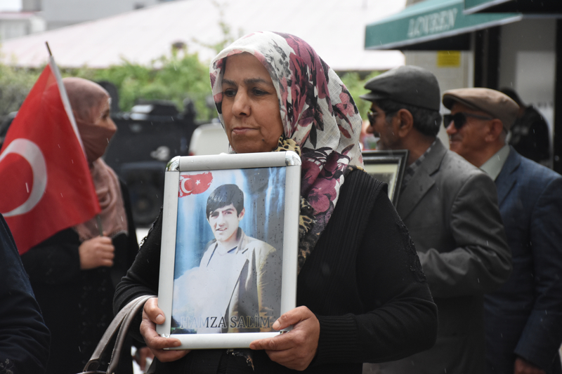 Menekşe Sokak'ta bir araya gelen aileler, "Şehitler ölmez vatan bölünmez", "Van anneleri evlat nöbetinde" yazılı dövizlerle çocuklarının resimlerini taşıdı.