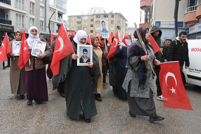 Terör örgütü PKK aleyhine slogan atarak DEM Parti İl Başkanlığı binasının önüne kadar yürüyen aileler, yağmurlu havada çocuklarına seslerini duyurmaya çalıştı.
