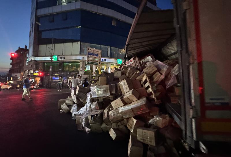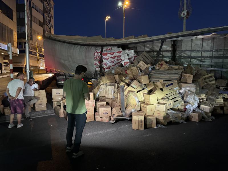 Kısmen yan yatan tırın dorsesinin demir aksamı parçalanırken, dorsede yüklü makarna ve bakliyat dolu kutular yola saçıldı.