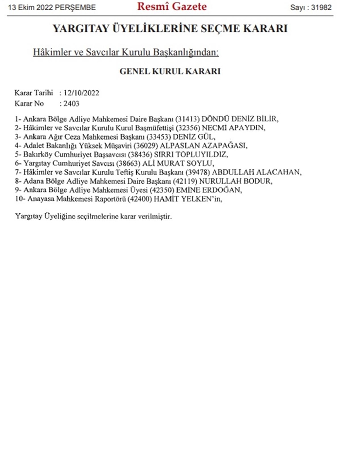 Buna göre, HSK Teftiş Kurulu Başkanı Abdullah Alacahan, Adalet Bakanlığı Yüksek Müşaviri Alpaslan Azapağası, Anayasa Mahkemesi Başraportörü Hamit Yelken, hakim Döndü Deniz Bilir, Bakırköy Cumhuriyet Başsavcısı Sırrı Topluyıldız, HSK Başmüfettişi Necmi Apaydın, Ali Murat Soylu, Deniz Gül, Nurullah Bodur ile 2020'de İdlib harekat bölgesinde rahatsızlanarak şehit olan Tuğgeneral Sezgin Erdoğan'ın eşi hakim Emine Erdoğan Yargıtay üyeliğine seçildi.