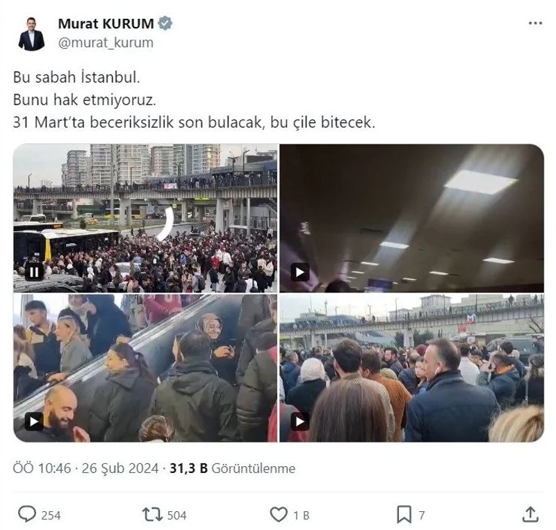 Cumhur İttifakı'nın İBB Başkan adayı Murat Kurum da sosyal medya hesabından metro istasyonundaki yoğunluğu paylaştı. Kurum "Bu sabah İstanbul. Bunu hak etmiyoruz. 31 Mart'ta beceriksizlik son bulacak, bu çile bitecek" ifadelerini kullandı.
