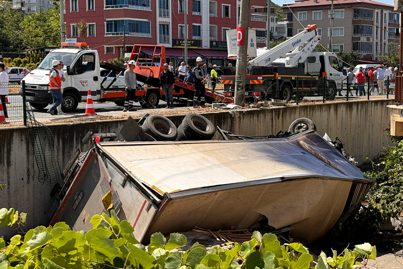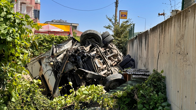 Çarpışmanın etkisiyle kamyon, bariyeri aşarak bir evin bahçesine devrildi.