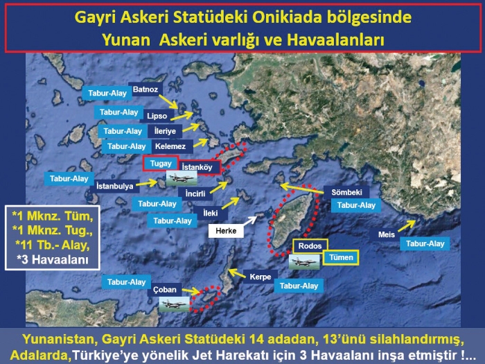 Yine gayri askeri statüde bulan adalardan Rodos'a 1 Yunan Mekanize Tümeni; İstanköy'e 1 Yunan Mekanize Tugayı, Batnoz, Lipso, İleriye, Kelemez, İstanbulya, İncirli, Sömbeki, İleki, Çoban, Kerpe ve Meis olmak üzere toplam 11 adaya da tabur- alay seviyesinde askeri birlik konuşlandırıldı. Tüm bu birliklere yüzlerce tank, zırhlı araç, top ve binlerce asker yerleştirildi. Gayri askeri statüdeki 23 adadan sadece Herke Adası'nda askeri birlik yok.