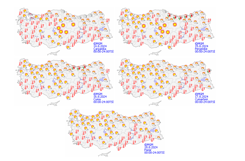 HAVA SICAKLIĞINDA ÖNEMLİ BİR DEĞİŞİKLİK BEKLENMİYORMeteoroloji Genel Müdürlüğünden alınan tahminlere göre, hava sıcaklığında önemli bir değişiklik beklenmiyor. Batı ve kıyı kesimlerde mevsim normalleri üzerinde, diğer yerlerde mevsim normalleri civarında seyretmesi bekleniyor. Rüzgarın genellikle kuzeyli, öğle saatlerinde Akdeniz kıyıları ile Güneydoğu Anadolu'da güneyli yönlerden hafif, ara sıra orta kuvvette, Marmara, Kuzey Ege kıyıları ile Batı Karadeniz kıyılarında kuvvetli (40-60 km/saat) olarak eseceği tahmin ediliyor.