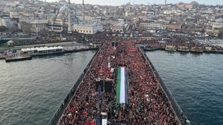 "Ben insanlarımıza diyorum ki öfkelerini alsınlar, aynı zamanda vicdanlarını da alsınlar, 1 Ocak sabah saat 08.30'da Galata Köprüsü'nde olsunlar. Hep beraber Filistin halkının sesi olalım. Bu soykırıma güçlü bir tepki gösterelim. İs kokmuş dünyaya iz bırakarak başkaldırmış olalım. Dün Ayasofya açılamazdı, açıldı, zincirler kırıldı. Bugün Emevi (Camii) esaretten kurtuldu. Yarın da Aksa özgürlüğüne kavuşacak. Bundan hiç şüphemiz yok. Vicdanı hür, fikri hür, kalbi hür, bütün vatandaşlarımız bunu çok iyi bilsinler. Mescid-i Aksa ve kadim Filistin sokakları da özgürleşecek. Buna katkı sağlamak için hep beraber 'Bir güneş doğuyor.' diyoruz. Bu mottoyla, bu moralle, bu motivasyonla orada hep beraber olmak istiyoruz."