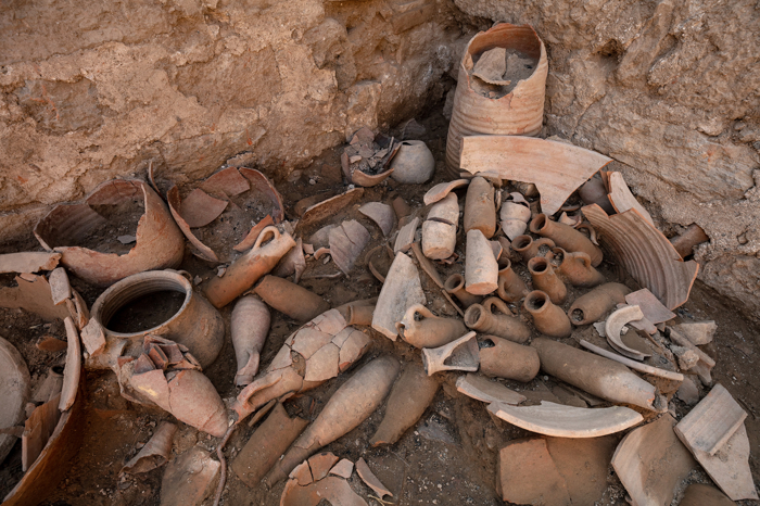 "Bu yerleşim alanındaki odalar 3-4 metre yüksekliğe kadar korunmuş ve tamamen büyük bir yıkım tabakasıyla örtülmüş. Tabakaların altından inanılmaz derecede zengin bir buluntu topluluğu ortaya çıktı. Sayıları binlerle ifade edilen seramik kaplar bulundu. Bunların arası midye ya da istiridye gibi deniz ürünlerinin kalıntılarıyla dolu.Tüm kaseler ya da tuzlanmış uskumru ile doldurulmuş amforalar (çömlek) çıkarıldı. Ayrıca şeftali, badem ve zeytin çekirdeklerinin yanı sıra kömürleşmiş bezelye ve baklagillere ait tohumlar da diğer buluntular arasında. Özellikle dört altın sikke ve bronz sikkelerin bulunduğu birkaç dükkanın kasası dikkat çekici. Kazılan odalar mutfak, depo, taberna, kandil ve Hristiyan hacı hediyelik eşyalarının bulunduğu dükkan ve ekli bir satış odası olan bir atölyedir. Burada Hristiyan hacılara hediyelik olarak satılan ve boyunda taşınabilen çok sayıda küçük hacı şişesi keşfedildi."