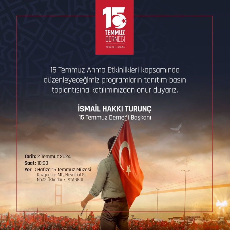 Temmuz Derneği Başkanı İsmail Hakkı Turunç, Hafıza 15 Temmuz Müzesi'ndeki basın toplantısında, programda darbe, direniş ve özgürlük temalarının yanında etkinliklerle Gazze'de yaşananlara dikkat çekeceklerini söyledi.