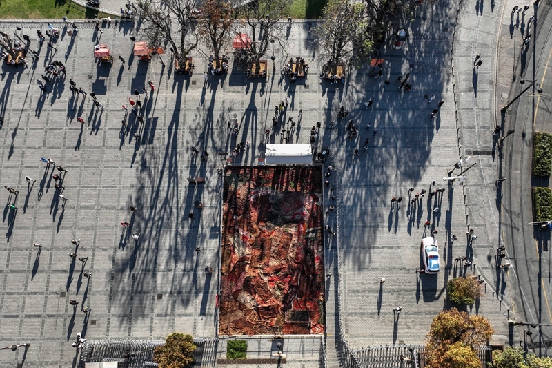 "Tarihi alanlarda gezerken karşılaşılan bu tarz bir çalışma, izleyenlerde farklı duygular oluşturdu. Bu ülkenin Gazze'ye olan derdini de ortaya koymuş olduk. Sergimiz kasım ayının sonuna doğru buradan ayrılacak. Niyetimiz farklı noktalarda bu serüveni devam ettirmek. Projede 105 halı kullandık. Bu çalışma özelinde 300 metrekarelik bir alan kapatıldı. Bu halıların hemen hemen hepsi 100 yılı aşkın gerçek halılar yani el dokuması. Kök boyalarla hazırlanmış. Kendisi de kadim bir sanat eseri aslında. Disiplinlerarası bir çalışma oldu. Yani bir sanat eserinin, farklı bir güncel ya da kavramsal sanat performansına dönüşmesi sağlanmış oldu. Büyük bir atölyede yaklaşık 8 kişilik bir ekiple bu çalışmayı sürdürdük. Toplamda da 25 günlük bir süre, İstanbullulara, dünyanın farklı ülkelerinden gelen insanlara ve Türkiye'deki sanatseverlere hatta yoldan geçen herkese bir ibretlik oluşturacak."
