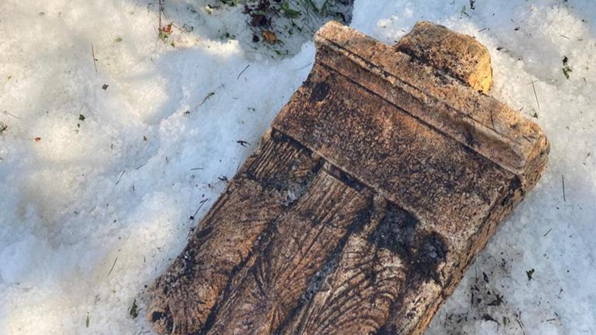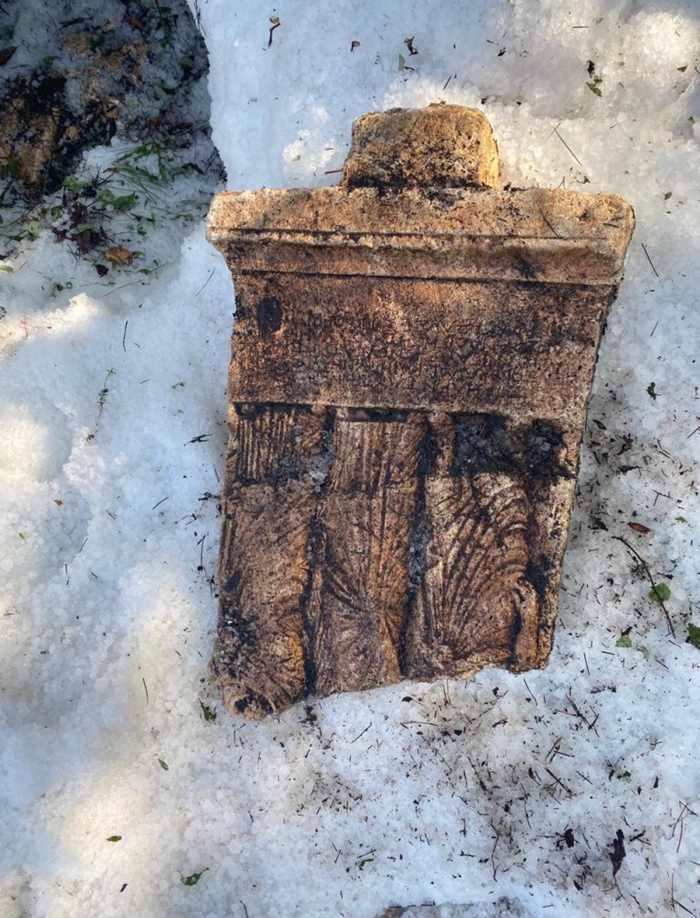 Ormanlık alanda yapılan aramada, doğal kaya parçasının altına gizlenmiş 3 parça halinde Roma dönemine ait olduğu değerlendirilen mezar taşı bulundu.