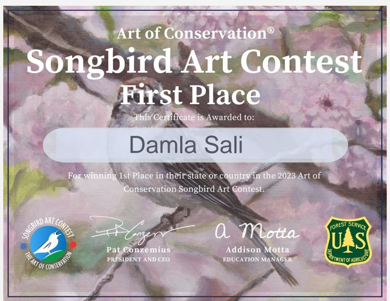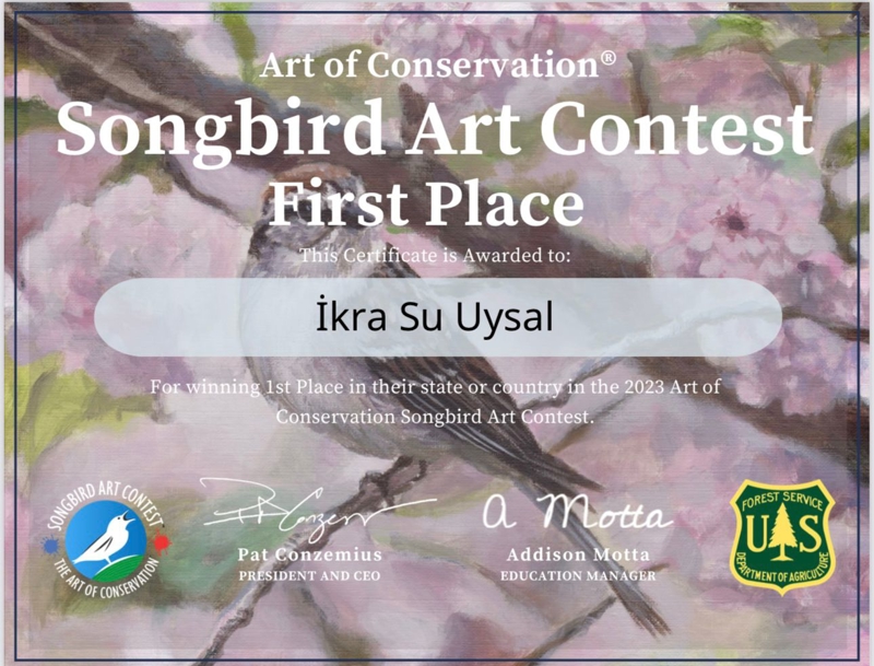 The Art of Conservation, Songbird Art Contest, Wildlife Forever tarafından düzenlenen ve Kuzey Amerika ötücü kuşların tür çeşitliliğini paylaşmaya odaklanan uluslararası sanat yarışmasına; Küçükçekmece Bilim ve Sanat Merkezinden 20 resim öğrencisinin, Görsel sanatlar öğretmeni Nur Can rehberliğinde katıldıkları Uluslararası Amerika ötücü kuş resim yarışmasında yaş kategorilerine göre; Türkiye'den 16 yaş Damla SALİ, 14 yaş İkra Su UYSAL, uluslararası birincilik elde etmişlerdir.
