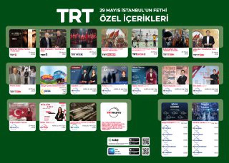 "Kalbimizdeki İzler – İstanbul'un Fethi" programında, İstanbul'un fethine dair izler; ezgiler ve görseller aracılığıyla 29 Mayıs Perşembe günü saat 18.50'de ekranlara gelecek. "Haberdar – İstanbul'un Fethi Özel" programında ise İstanbul'un fethinin 572. yılı anısına, fetih öncesi ve sonrası döneme ilişkin önemli detaylar işlenecek. Program saat 21.30'da izleyicilerle buluşacak. Saat 23.20'de başlayacak olan "Fethin İzinde" programı ise İstanbul'un fethinin yıl dönümünde Mehmet Lütfi Arslan'ın sunumuyla TRT Türk'te yayınlanacak.