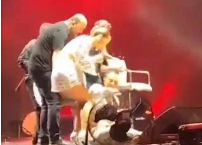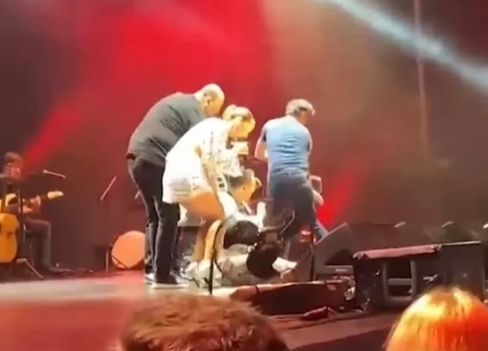 Görevlilerin yardımıyla yerden kaldırılan 52 yaşındaki ünlü şarkıcı konserine kaldığı yerden devam etti.