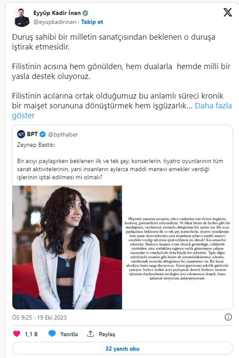 Sosyal medya hesabından yaptığı paylaşımına, "Duruş sahibi bir milletin sanatçısından beklenen o duruşa iştirak etmesidir." sözleriyle başlayan İnan, Filistin'in acısına hem gönülden, hem dualarla hem de milli bir yasla destek olunduğunu belirtti.