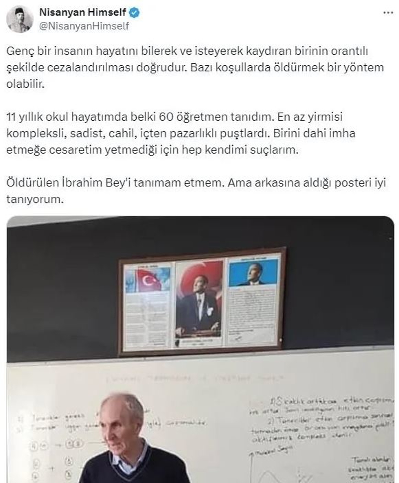 Nişanyan, sosyal medya hesabından yaptığı paylaşımda, cinayeti savundu ve şu ifadelere yer verdi: Genç bir insanın hayatını bilerek ve isteyerek kaydıran birinin orantılı şekilde cezalandırılması doğrudur. Bazı koşullarda öldürmek bir yöntem olabilir.