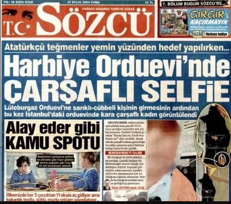 CHP yandaşı Sözcü Gazetesi yine provokasyona girişti. Saygı Öztürk'ün "Orduevlerinde bir şeyler değişti" başlıklı yazısında "Lüleburgaz Orduevi'ne sarıklı-cübbeli kişinin girmesinin ardından bu kez İstanbul'daki orduevinde kara çarşaflı kadın görüntülendi" şeklinde skandal ifadeler kullanıldı.