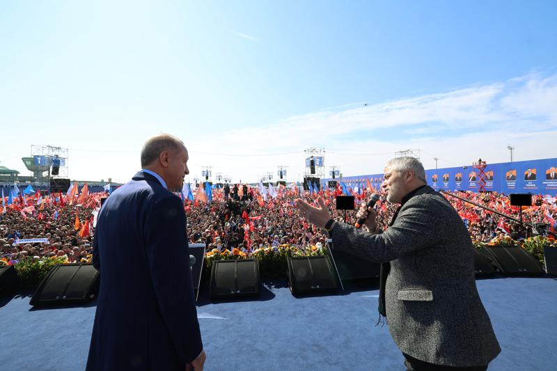Konuşmasını tamamlayan Cumhurbaşkanı Erdoğan, AK Parti İl Başkanı Kabaktepe, MHP İstanbul İl Başkanı Selim, Cumhur İttifakı'nın İBB Başkan adayı Kurum ve 38 ilçenin belediye başkan adaylarını sahneye davet etti. Cumhurbaşkanı Erdoğan, Cumhur İttifakı'nın Silivri Belediye Başkan adayı Volkan Yılmaz'ın rahatsızlığı nedeniyle mitinge katılamadığını söyledi.
