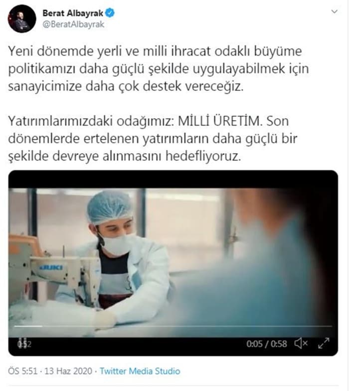 Bakan Albayrak, Twitter hesabından yaptığı açıklamada, "Yeni dönemde yerli ve milli ihracat odaklı büyüme politikamızı daha güçlü şekilde uygulayabilmek için sanayicimize daha çok destek vereceğiz. Yatırımlarımızdaki odağımız: Milli üretim. Son dönemlerde ertelenen yatırımların daha güçlü bir şekilde devreye alınmasını hedefliyoruz" ifadelerini kullandı.