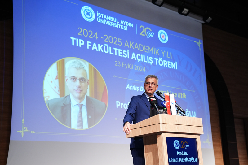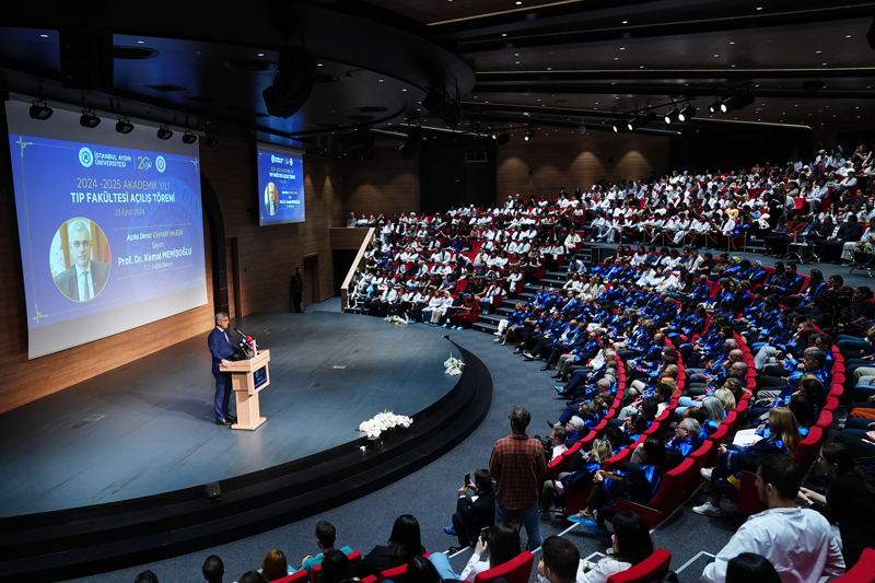 Bakan Memişoğlu, Küçükçekmece'deki İstanbul Aydın Üniversitesi Sosyal Bilimler Kampüsü'nde gerçekleştirilen Tıp Fakültesi 2024-2025 Akademik Yılı Açılış Töreni'nde, "Cerrahi ve Etik" konulu açılış dersinde konuştu.
