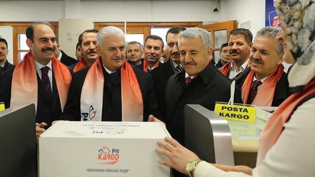 Cerablus'ta Mehmet Kıkar isimli bir vatandaşa içinde kışlık giyecek olan kargo gönderen Yıldırım, "PTT, işini çok titiz, profesyonel yapıyor. PTT'nin bir ferdi olarak sizler de bu haklı gururu yaşıyorsunuz. Her zaman darda olan kardeşlerimize yardım elini uzatmak bizim devlet geleneğimizde var. Bizim geçmişimizde var. Cerablus'taki Mehmet kardeşimize bunu sağa salim iletirseniz memnun olurum." dedi.