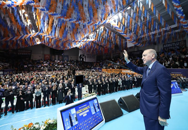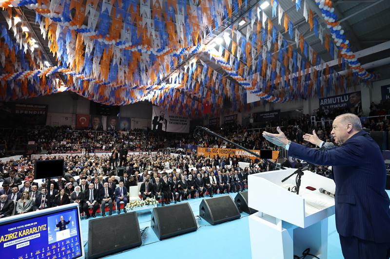 Salondakilere, "Ana kademesiyle, kadın ve gençlik kollarıyla, mahalle ve köy temsilcileriyle, sandık görevlileriyle 31 Mart'a kadar gece gündüz çalışmaya var mıyız?" diye soran Cumhurbaşkanı Erdoğan'a partililer "Evet" diye karşılık verdi.