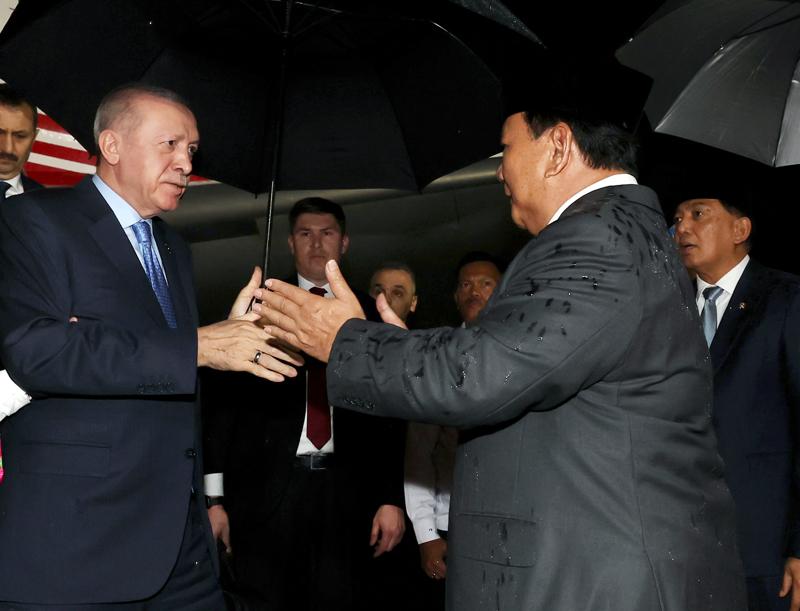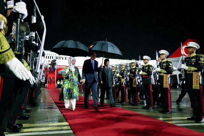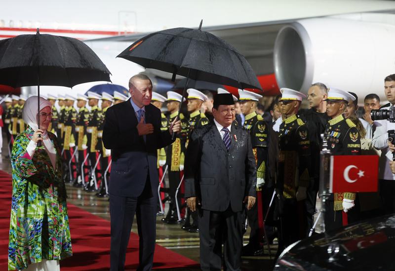 Cumhurbaşkanı Erdoğan'ı, Halim Perdanakusuma Askeri Havalimanı'nda, Endonezya Cumhurbaşkanı Prabowo Subianto, Türkiye'nin Cakarta Büyükelçisi Talip Küçükcan ve diğer yetkililer karşıladı.