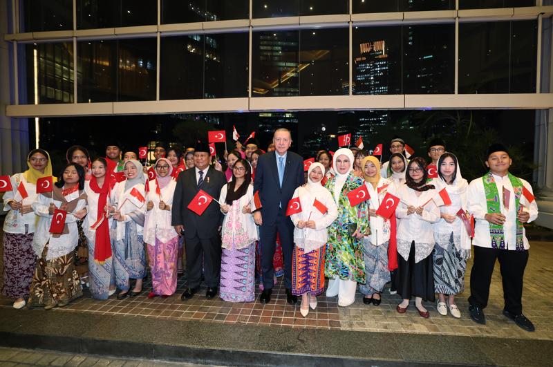 Cumhurbaşkanı Erdoğan ve eşi Emine Erdoğan, konaklayacakları otele gelişinde, ellerinde Türk ve Endonezya bayraklarıyla kendilerini karşılayan Endonezyalı çocuklarla hatıra fotoğrafı çektirdi, ayaküstü sohbet etti.